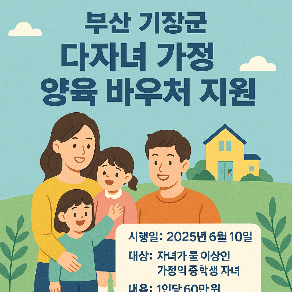 부산 기장군은 지난 6월 4일 공식 발표를 통해, ‘다자녀 가정 양육 바우처 지원 사업’을 오는 6월 10일부터 시행한다고 밝혔습니다.